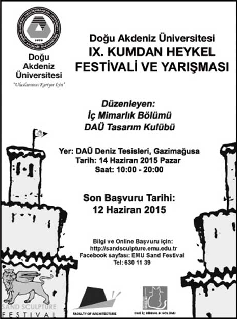 Geleneksel DAÜ 9. Kumdan Heykel Festivali ve Yarışması DAÜ Deniz Tesisleri’nde başladı. Doğu Akdeniz Üniversitesi (DAÜ) Mimarlık Fakültesi, İç Mimarlık Bölümü ve DAÜ Tasarım Kulübü tarafından düzenlenen ve geleneksel hale gelen “DAÜ Kumdan Heykel Festivali ve Yarışması”nın bu yıl dokuzuncusu 14 Haziran 2015, Pazar günü 10:00 – 20:00 saatleri arasında Gazimağusa, DAÜ Deniz Tesisleri’nde (Beach Club’da) yapıldı.